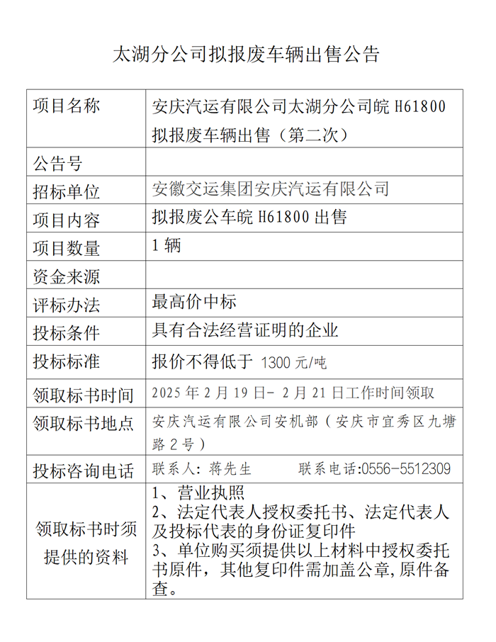 太湖分公司擬報廢車(chē)輛出售公告
