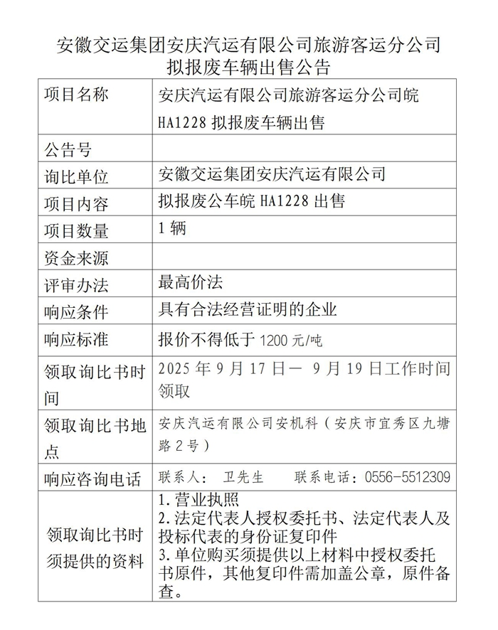 旅游客運分公司擬報廢車(chē)輛出售公告