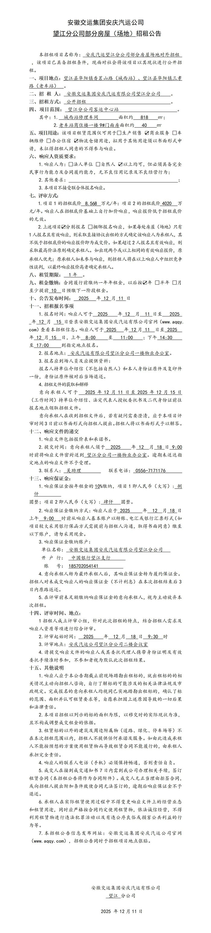 望江分公司部分房屋(場(chǎng)地)招租公告
